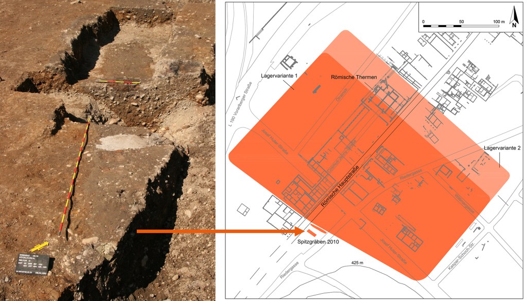 Vom Militärlager, in dem Afinius und Novellus ihren Dienst verrichteten, wurde bislang nur ein kleiner Ausschnitt bei Ausgrabungen 2010 auf dem Areal des früheren Unfallkrankenhauses Dr. Böckle genauer untersucht. Dort kamen zwei mehrere Meter breite wie tiefe und im Querschnitt V-förmige Verteidigungsgräben ans Tageslicht, die das Lagerareal nach Südwesten hin begrenzten (Abb. 3). Von der Umwehrungsmauer und den Innengebäuden haben sich nur die in den Boden eingetieften Fundamentgräben und Pfostenlöcher erhalten. Die aufragenden Baustrukturen aus Holz, Erde, Lehm etc. wurden bei der Räumung des Militärlagers in der Mitte des 1. Jahrhunderts geschliffen, um das Areal für eine folgende Bebauung mit Zivilgebäuden vorzubereiten. Die Ausdehnung der ursprünglich militärisch genutzten Fläche nach Nordosten hin ist mangels fehlender Ausgrabungsergebnisse noch unbekannt – plausibel erscheint eine Ausdehnung bis zu den späteren römischen Thermen (öffentliche Badeanlage) unter der evangelischen Kreuzkirche auf dem Ölrain und damit eine Größe zwischen 5,3 ha (Abb. 3, rot) und 6,5 ha (Abb. 3, hellrot), was nicht weniger als 7–9 durchschnittlichen Fußballfeldern entspricht. Für römische Militärlager ähnlicher Größe und Zeitstellung wird eine Besatzung zwischen 1.500 und 2.500 Soldaten vermutet. Um diese Zahl für das Lager in Bregenz näher eingrenzen zu können, müssten v. a. Anzahl und Größe der Mannschaftsunterkünfte bekannt sein, was zukünftigen Forschungen vorbehalten bleiben muss.