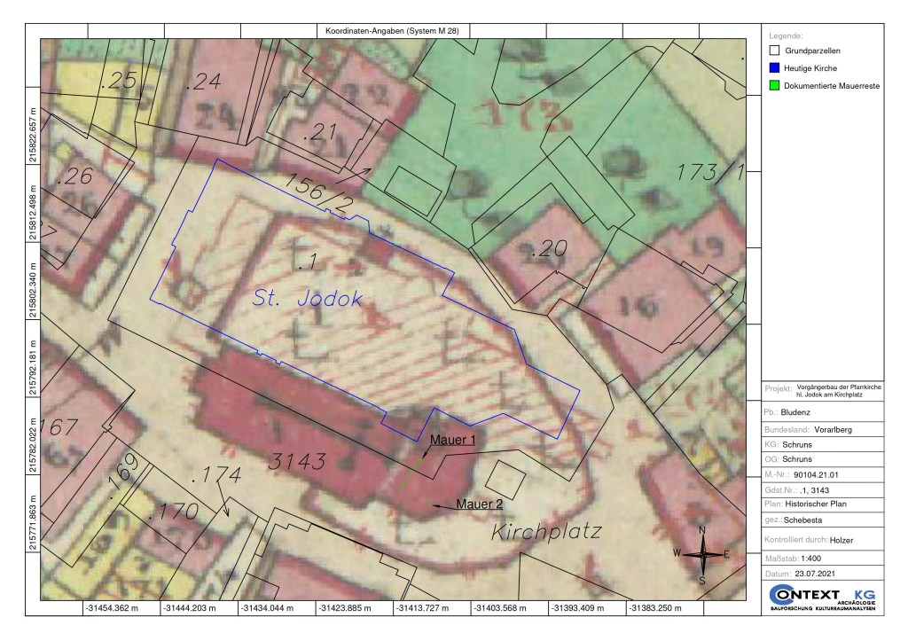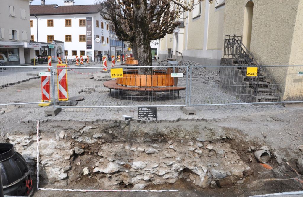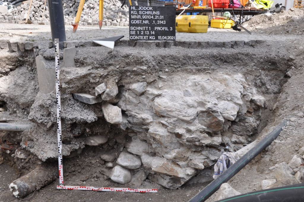 Die Gegenwart trifft in der Erde oft auf die Vergangenheit. Im Frühjahr 2021 stieß man am Kirchplatz von Schruns bei Baggerarbeiten auf zwei Steinmauern, die einen Blick auf die alte Kirche von Schruns, den Vorgängerbau des heutigen Münsters St. Jodok, ermöglichten.
