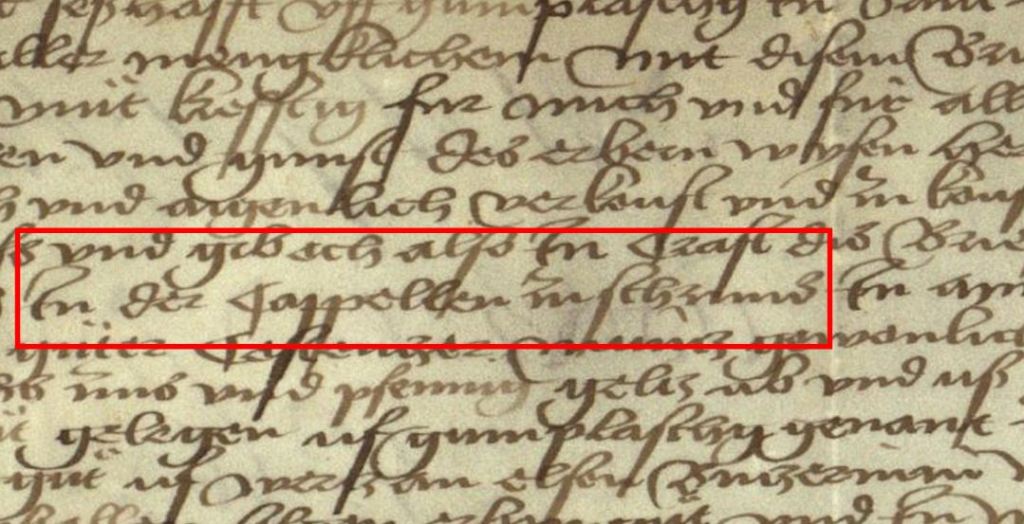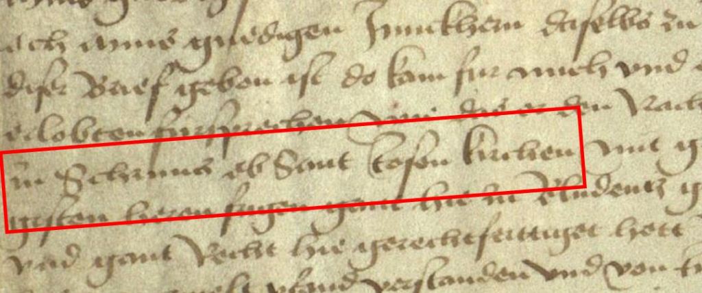 Abb.4: Urkunde über einen Gantbrief „(…) in Schruns ob SantJosen Kirchen (…)“ (Detail) Feder auf Pergament, Januar 1482 (Vorarlberger Landesarchiv, Stand Montafon, 4282).