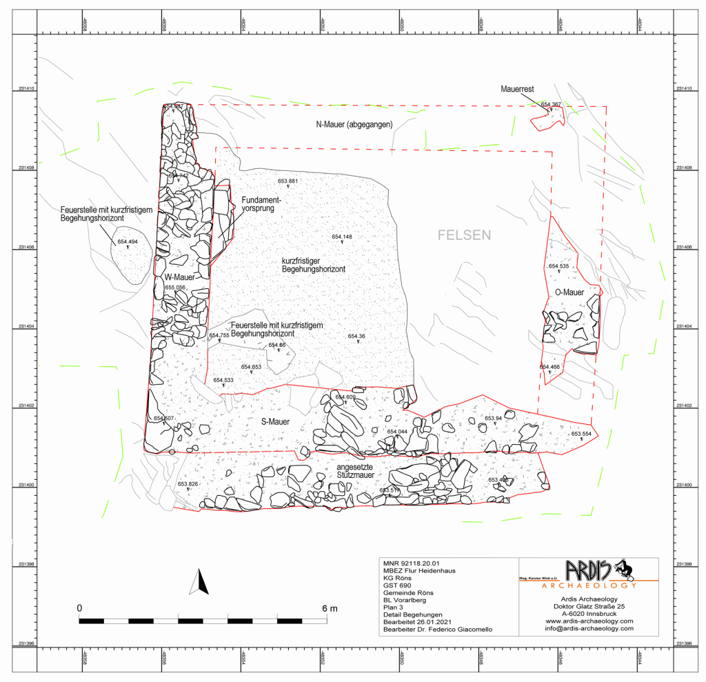Im Zuge wiederholter Begehungen fielen ihm Reste von Mörtel sowie etwas Steinmaterial im Bereich der Hügelkuppe auf. Er initiierte in der Folge ein Projekt, das mit der Unterstützung der Leaderregion Vorderland – Walgau – Bludenz, dem Bundesdenkmalamt, der Gemeinde Röns, der Agrargemeinschaft Röns sowie privaten Geldgebern finanziert wurde. Nach drei Grabungskampagnen stand am „Heidenhaus“ ein überraschender Befund fest. Trotz seines schlechten Erhaltungszustandes erzählt er sowohl von Machtpolitik und Streitigkeiten als auch von der Nachnutzung der Ruinen durch die der einfache Landbevölkerung.