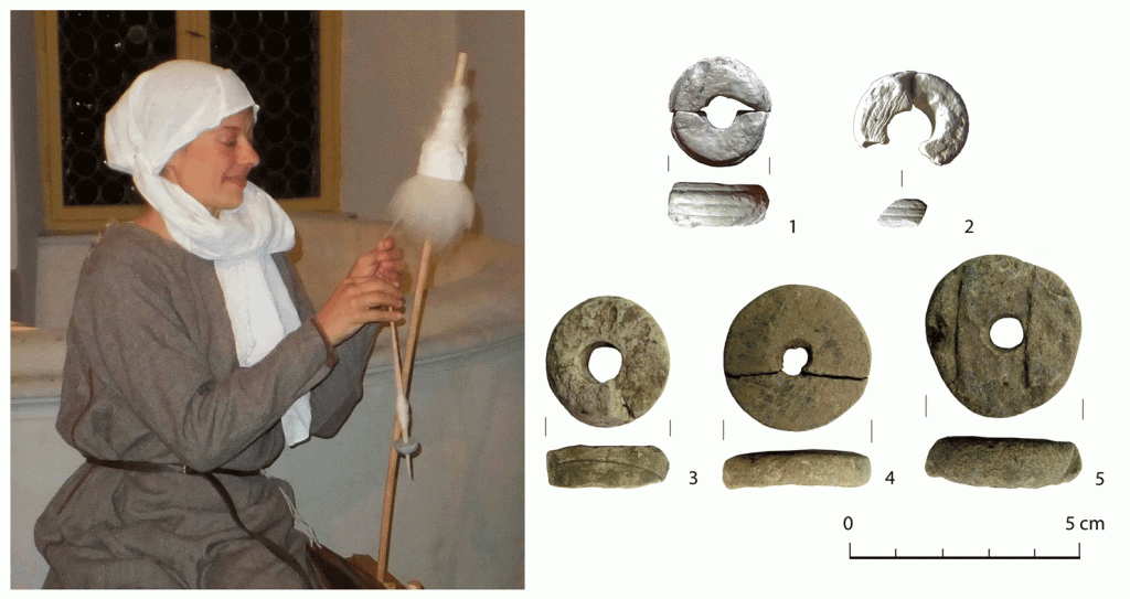 Die interessanteste Fundgruppe bilden die Spinnwirtel. Drei ganze und zwei fragmentierte Spinnwirtel blieben erhalten. Bei einem Spinnwirtel handelt sich um das Schwunggewicht einer Handspindel, die dem Verspinnen von Fasern (z.B. Wolle) zu Garn diente. Während der Schaft meist aus vergänglichem Holz gefertigt war, bestand der Wirtel oft aus unvergänglichen Materialien wie gebranntem Ton, Stein, Knochen, Metall, Bernstein oder ähnlichem. Damit das Spinnen auch gut gelingt, also eine möglichst lange, gleichmäßige und taumelfreie Drehbewegung möglich wird, muss der Spinnwirtel eine gute Rotationsform und ein gewisses Gewicht aufweisen. Um die Brauchbarkeit der Spinnwirtel vom „Heidenhaus“ zu überprüfen, wurde ein Experiment durchgeführt: Der größte und schwerste Wirtel wurde auf einen, nach spätmittelalterlichen Funden rekonstruierten, hölzernen Spindelstab gesteckt und damit Wolle vom Jakobsschaf gesponnen. Damit konnte eine Fadenstärke von rund 0,5 mm erzielt werden.