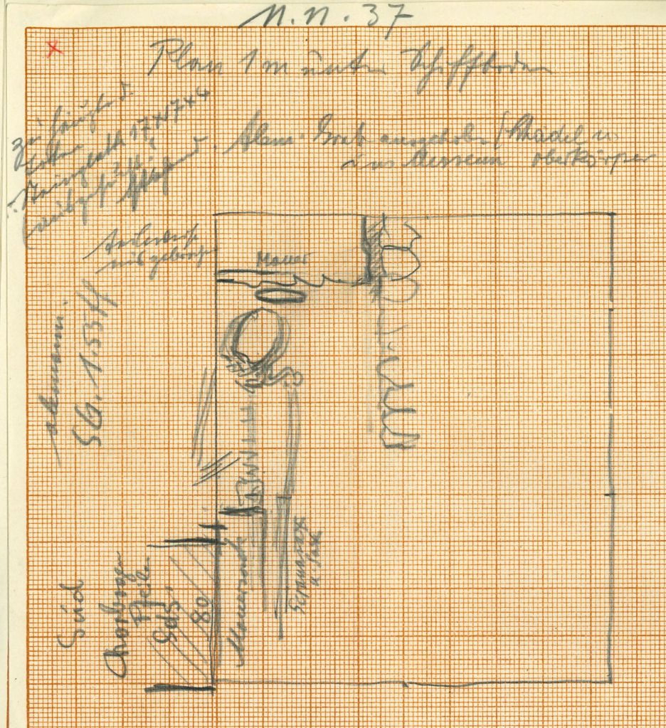 Denn was wir heute an der bestehenden Kirche sehen, ist eigentlich nur die (vorläufig) letzte Phase einer langen Geschichte. Ob der hl. Gallus im Jahr 610 tatsächlich an genau diesem Ort war, werden wir vielleicht nie erfahren. Die sagenumwobene Aureliakirche der Spätantike, von der die Heiligenvita berichtet, könnte sich auch in der Oberstadt oder am Leutbühel befunden haben. Was wir aber evidenzbasiert wissen, ist, dass ca. im 7. Jahrhundert n. Chr. ein Mann mit Schwert an seiner Seite im Bereich der heutigen Kirche bestattet wurde. Dank aktueller Recherchen im Archiv des Vorarlberg Museums ist nun wieder bekannt, wo sich dieses 1937 entdeckte „Alemannengrab“ genau befunden hat. Eine (hier erstmals publizierte!) maßstabsgerechte Skizze aus dem Grabungstagebuch Adolf Hilds (Abb. 2) liefert die entsprechende Information.