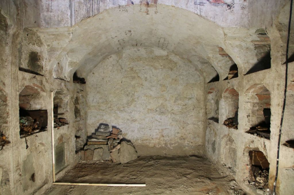 Wohl im Zuge der Barockisierung 1737/38 errichtete man vor den Chorstufen eine unter dem Kirchenboden liegende, mannstiefe, begehbare Gruft, die 36 (!) Priestergräbern Platz bieten sollte. Diese Priestergruft (Abb. 4), ein sogenanntes Columbarium, konnte nun wiederentdeckt und vorübergehend geöffnet werden. Über eine rechteckige Öffnung im Boden gelangt man in den zentralen, quer zum Kirchenschiff liegenden Gewölberaum. Die ziegelgemauerten und ebenfalls tonnengewölbten eigentlichen Grabnischen liegen an der West- und Ostseite und bilden drei Reihen zu je sechs Gräbern.