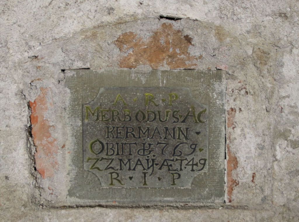An der Westseite sind alle 18 Nischen tatsächlich besetzt, 12 davon auch noch zugemauert. Hier befindet sich in der südlichen Ecke eine aufgemalte Bezeichnung „FCH 1742“, die noch nicht aufgelöst werden konnte, jedoch in die Errichtungszeit der Gruft weist. Die übrigen sechs Nischen an der Westseite sind entweder später aufgebrochen worden bzw. besaßen nur eine Holzplatte als Abdeckung. Die einzige (erhaltene) steinerne Inschrift markiert das Grab von P. Merbod Ackermann OSB, Praebendar von 1757 bis 1769 (Abb. 5). An der Ostseite der Gruft, in der nördlichen Hälfte, befinden sich noch drei vermauerte und drei offene belegte Grabstellen. Die übrigen Nischen sind leer (Abb. 6). Die Benutzung der Priestergruft war nicht von langer Dauer, da unter Kaiser Joseph II. ab 1782 Bestattungen innerhalb der Kirchen nicht mehr üblich waren. Bemerkenswert ist, dass aus den Schriftquellen für diesen Zeitraum lediglich 10 Priester bekannt sind, die in dieser Gruft bestattet worden sein könnten. Im archäologischen Befund liegen dagegen 24 Bestattungen vor. Jede einzelne enthält noch Reste der Holzsärge, Textilien und menschliche Überreste. Um dieser letzten Ruhestätte mit der nötigen Pietät zu begegnen, ist geplant, die Gruftöffnung wieder zu verschließen und optisch dem Fußboden anzugleichen.