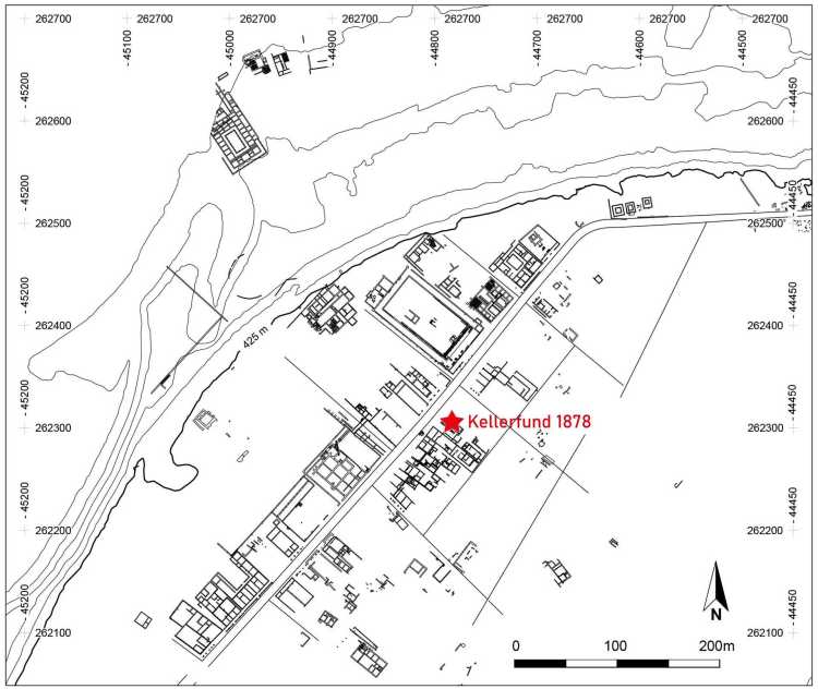 Wie durch Jennys Dokumentation (Abb. 3 und 4) erkennbar ist, entdeckte er nicht nur eine vereinzelte Kelleranlage, sondern auch ein obertägiges Gebäude, das u. a. mit Hypokausten ausgestattet war und ihn zu einer (falschen) Interpretation desselben als Bad verleitete. Doch schon Jenny erkannte Ende des 19. Jh., dass dieser Hypokaustenbau nicht Teil der ursprünglichen Kelleranlage und somit jünger als diese war. Somit ergab sich im Kontext der Auswertung die Problematik, dass sich unter den im vorarlberg museum inventarisierten Objekten auch jüngere Funde befinden konnten.