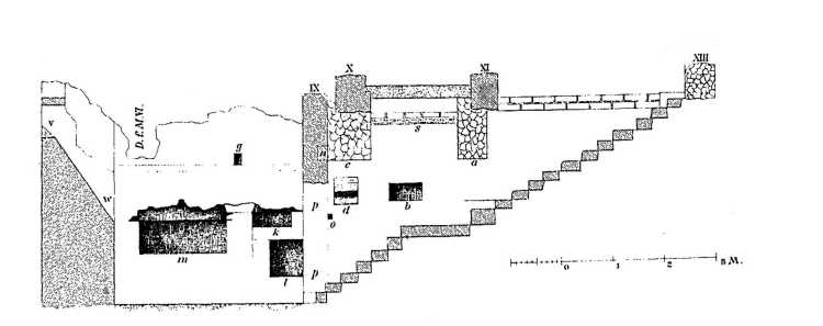 „Merkwürdig genug wurden sämtliche Nischen sowohl die unteren als die des Stiegenraumes buchstäblich leer aufgefunden; die große Menge der Geschirre und die übrigen Fundgegenstände kamen auf dem Kellerboden, hauptsächlich aber auf der Stiege vor; der Mittelteil der Stufen war offenbar frei gelassen für den Verkehr, dagegen in den Ecken fand ich die Stufe für Stufe überdeckt mit Geschirren, meist zusammengedrückt von der Last des Erdreichs, aber oft bis zum letzten Splitter vorhanden.“