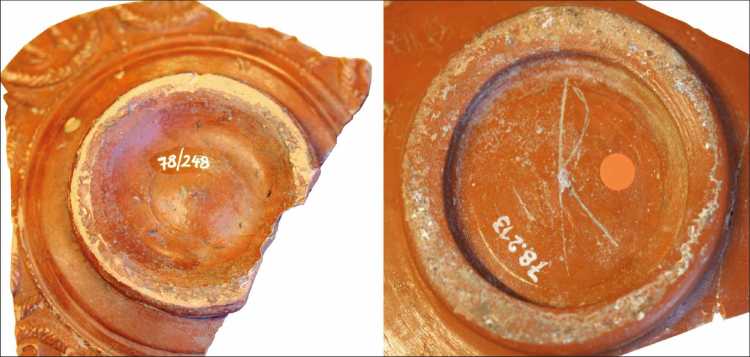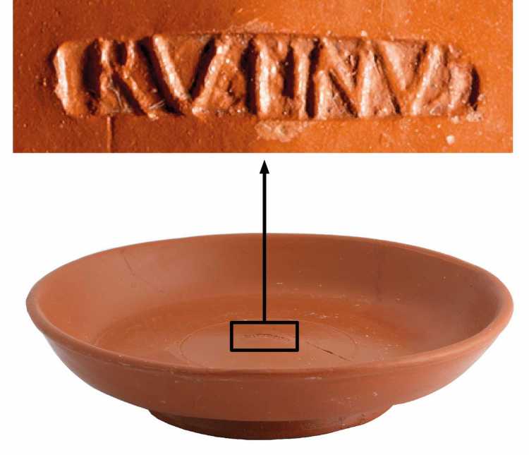 Ein wichtiges Indiz für die Chronologie des Kellerfundes bot insbesondere die Bestimmung der Töpferstempel, welche als Herstellermarken zumeist auf der Bodeninnenseite der Gefäße angebracht wurden und eine genaue Bestimmung der Werkstätten ermöglichen, die sie produzierten. Bei den sogenannten glatten Gefäßen des Kellerfundes (Abb. 5), die bis auf jene Stempel meist keinen weiteren Dekor tragen, ergab sich dadurch ein erster Hinweis auf einen Schwerpunkt bei den Produktionszentren von La Graufesenque und Banassac im heutigen Südfrankreich.