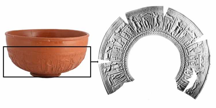 Die Bestimmung der stärker dekorierten Reliefware, welche in sogenannten Formschüsseln bzw. Modeln hergestellt wurde, gestaltete sich schwieriger: Sie fußt einerseits auf der stilistischen Analyse ganzer Dekorschemata (Abb. 6), andererseits auf der Betrachtung charakteristischer Einzelmotive wie Punzen oder Eierstäbe.