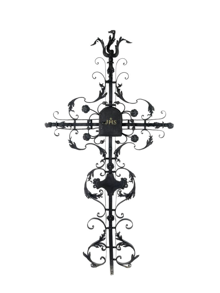 Im Jahr 2013 erschienenen Ausstellungskatalog „buchstäblich vorarlberg“ bat Johanna Kreis auf S. 83 die geneigte Leserschaft um Mithilfe bei einem scheinbar nicht lösbaren Rätsel rund um ein schmiedeeisernes Grabkreuz aus der 2. Hälfte des 18. Jahrhunderts. Auf der Abdeckung des Inschriftkästchens, das über dem Schnittpunkt der Kreuzbalken sitzt, ist – nach erfolgter Restaurierung – eindeutig in Goldfarbe auf schwarzem Untergrund „JHS“ mit einem lateinischen Kreuz über dem „H“ zu sehen.