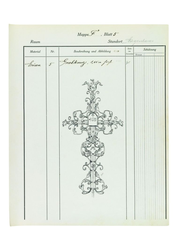 Ein Blick in die Inventare des Museums verwirrt zunächst. Diese wurden in der Zwischenkriegszeit neu geordnet (die wichtigeren Objekte erhielten die niedrigen Nummern) und handschriftlich übertragen. Sie beinhalten neben beschreibenden Informationen auch eine gekonnte Tuschfederzeichnung und Daten zu Herkunft und Erwerbung – für die Museumsarbeit fast 100 Jahre später ist das ein wahrer „Schatz“. Auf den ersten Blick ist das Grabkreuz unter der Inventarnummer F (wie Eisen) 005 wiederzuerkennen. Aber die Form des „IHS“ weicht deutlich vom heutigen Erscheinungsbild ab.