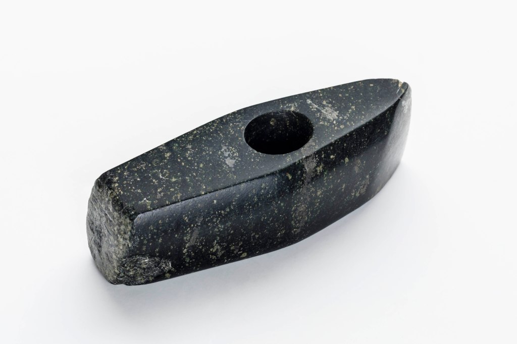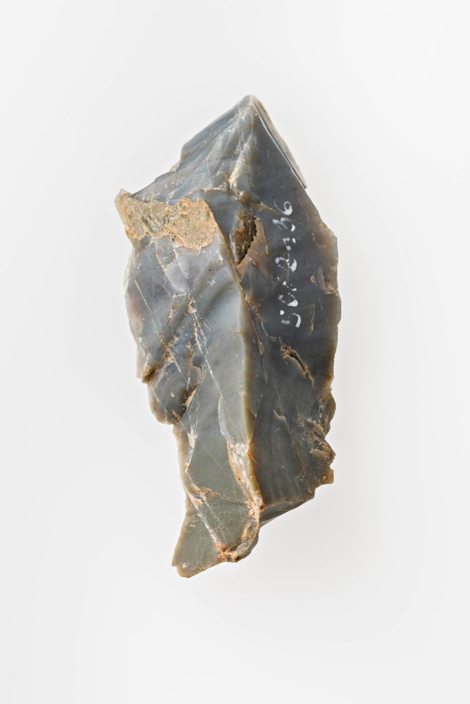 Ein paar Beispiele: In der Vitrine „Holzbearbeitung“ (Abb. 2) sind auch nachweislich nachgearbeitete Feuersteinklingen (Abb. 3) ausgestellt. Sie finden sich neben einfachsten geschliffenen, ab und an schon durchbohrten Steinbeilen (Abb. 4). Erst mehrere tausend Jahre später sind mit Kupfer und Zinn die Metalle entdeckt, die zu Bronze legiert (Abb. 5), den Steinbeilen weit überlegen sind. In den folgenden Jahrhunderten erlangten die Menschen Kenntnisse über Eisenerzabbau, Eisenverhüttung und Eisenbearbeitung. Damit ging eine Ausdifferenzierung der Werkzeuge einher: z.B. verwendete der römische Legionär bei Schanzarbeiten die dolabra, die in einem Gerät Axt (senkrechte Schneide) und Hacke (waagrechte Schneide) kombiniert; z.B verwendet der Zimmermann für das Zurichten der Balken und Bretter ein Beil mit einer einseitig geschliffenen, wesentlich längeren Klinge mit kürzerer Schäftung. Eine noch weitreichendere Veränderung in der Entwicklungsgeschichte kann von den Sägewerkzeugen erzählt werden. Bekannt wohl schon in der Mittelsteinzeit wird innerhalb von knapp 500 Jahren aus einer einfachen Säge eine Waldsäge, ein Fuchsschwanz, eine Spannsäge, eine Kreissäge und letztendlich eine Elektromotorsäge mit wieder aufladbarem Akku.