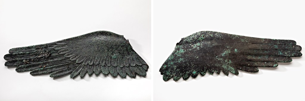 Im Brandschutt der Katastrophe fanden sich u. a. ein nahezu unversehrt gebliebener Flügel aus Bronze (Abb. 4). Im römischen Götterhimmel gab es nur eine Gottheit mit größeren Flügeln: die Siegesgöttin Victoria. Das Fundstück lässt demnach auf eine knapp unterlebensgroße Bronzestatue dieser Göttin schließen.