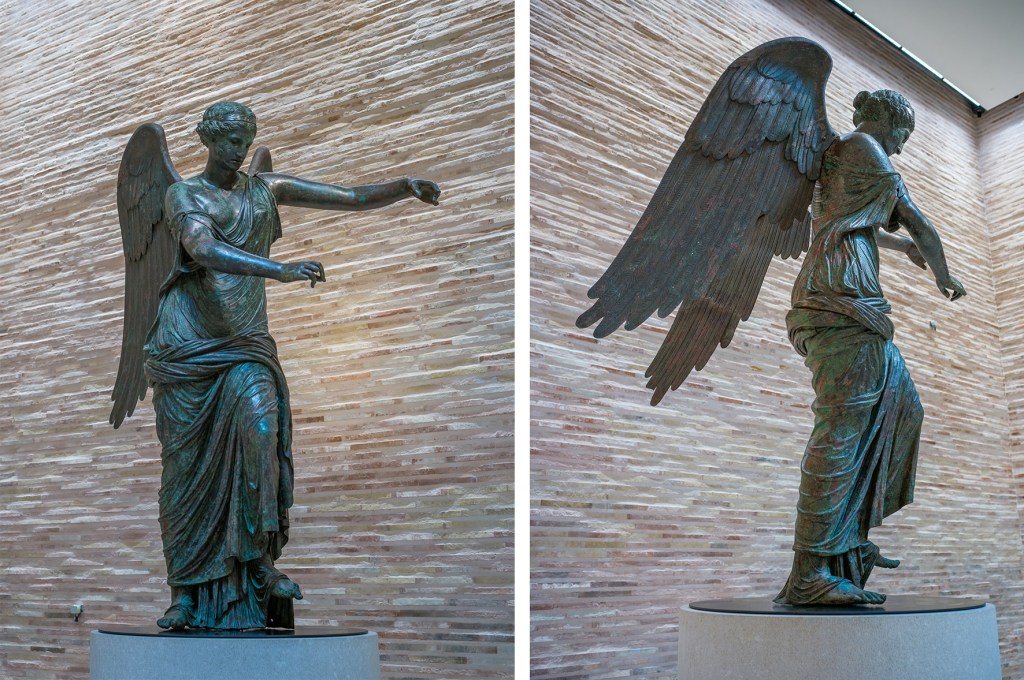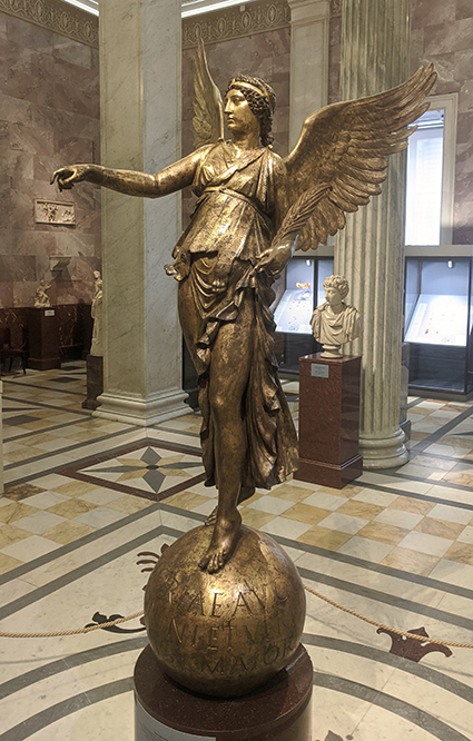 Etwas jünger ist die Victoria von Calvatone, die 10 Jahre später nahe Cremona gefunden wurde. Die Figur scheint wie auf einem Globus zu schweben. Die mädchenhafte Erscheinung ist geprägt von einer Leichtigkeit, die sich bis in die Flügelspitzen fortsetzt (Abb. 6). Eine Inschrift erinnert an die Siege Marc Aurels und Lucius Verus‘ gegen die Parther. Zahlreiche Teile wie der linke Arm und das linke Bein, aber auch die Flügel wurden ergänzt, nachdem trotz intensiver Suche keine weiteren Fragmente gefunden werden konnten. Mittlerweile steht die gut 1,70 m hohe Statue in der St. Petersburger Eremitage. Das Motiv ist in der griechischen Kunst schon Jahrhunderte früher verbreitet. Besonders bekannt ist eine der wenigen rundplastischen Darstellungen der griechischen Siegesgöttin Nike, die um 420 v. Chr. von Paionios von Mende geschaffen wurde. Die überlebensgroße Figur aus parischen Marmor diente wiederholt als Vorlage für Statuen verschiedener Größe und unterschiedlichen Materials. Mit Augustus gewann das Motiv in der Bildsprache der frühen römischen Kaiserzeit zunehmend an Bedeutung.