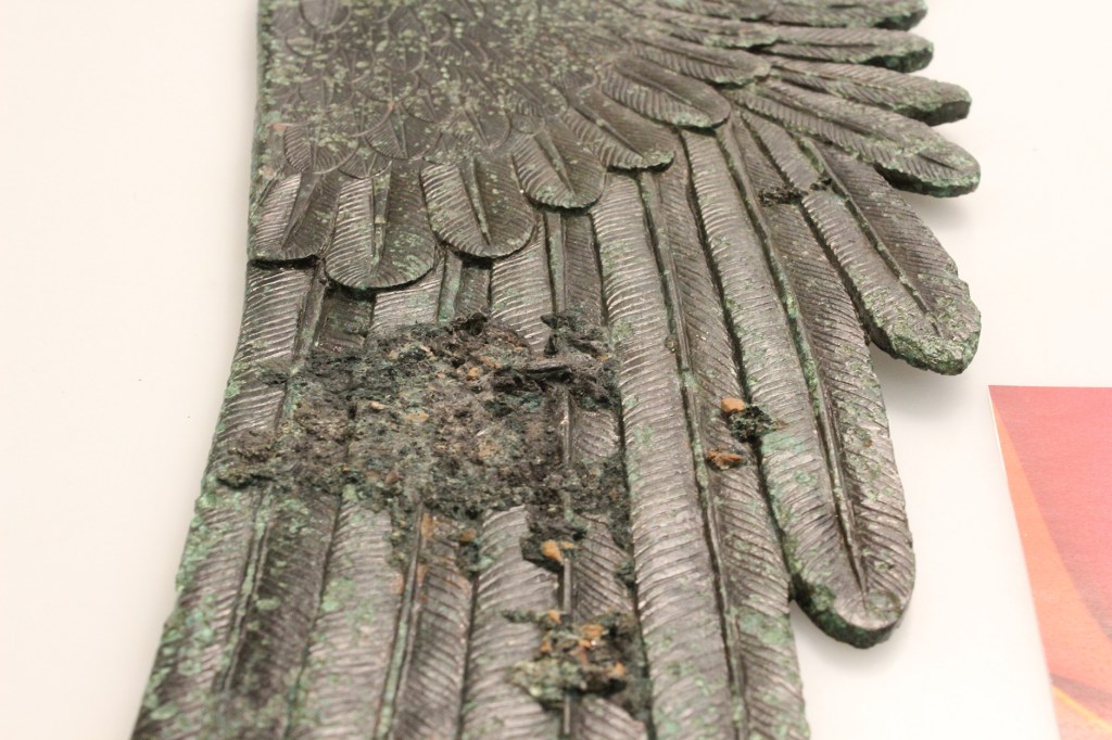 Die kunsthandwerkliche Ausführung des Bregenzer Flügels entspricht allerdings nicht jener der genannten Beispiele. Das Stück ist nahezu flach und weist nicht den aus der Natur bekannten, gewölbten Querschnitt eines Flügels auf. Im Zuge der Restaurierung, bei der auch Brandrückstände am Objekt stabilisiert werden konnten, kamen Details zum Vorschein, die auch die Rekonstruktion der Bearbeitungsschritte bei der Herstellung zulässt: Zunächst wurde eine offene Grundform mit einer Buntmetalllegierung gegossen und die Schwinge anschließend ausgeschnitten (Abb. 7). Details wie das Gefieder wurden in der Folge mit einem Werkzeug, das einem Kanaleisen heutiger Bildhauer entsprochen haben wird, ausgearbeitet. Ein genauer Blick kann eine detailliert gearbeitete Schauseite und eine weniger akkurat gestaltete Rückseite im Blickschatten des jeweiligen Betrachters ausmachen (vgl. Abb. 4).