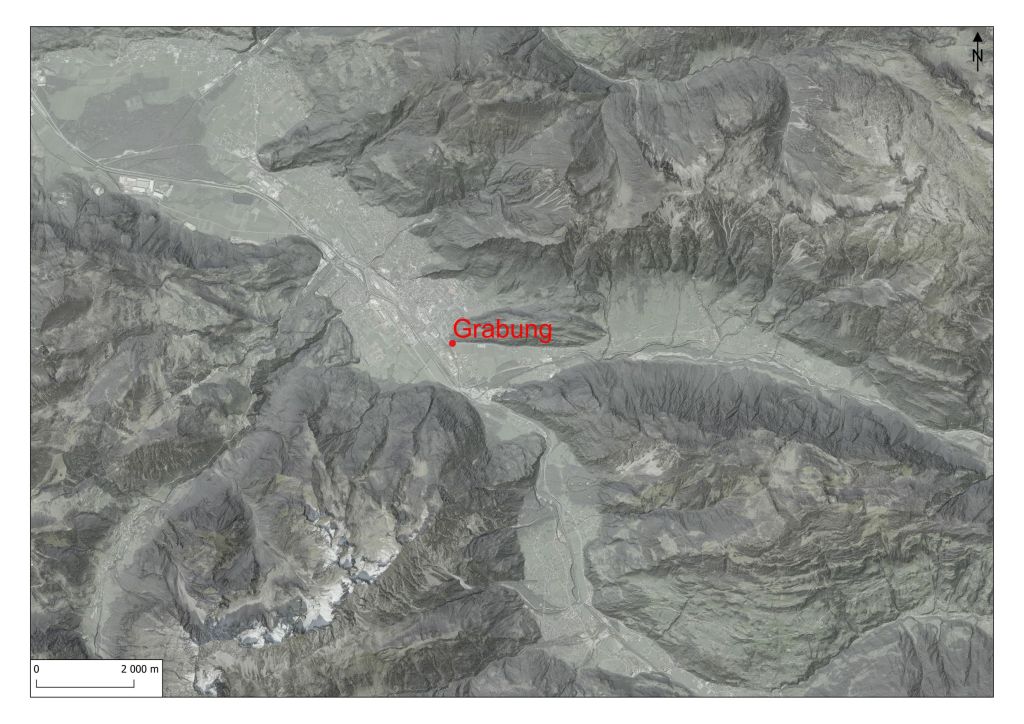 Dicht unter der Grasnarbe kam die Straßentrasse des 18./19. Jahrhunderts zutage, die aus einer starken randlichen Befestigung und einem aus Bruchsteinen und Mörtel verbackenen Straßenkörper bestand (Abb.4). Ganz eindeutig folgt auch die heutige Bundesstraße noch dieser Straßenflucht, wie aus einem Luftbild ersichtlich wird (Abb.5). Dieser alte Verlauf, vor dem Einschnitt der Eisenbahn, kann auch im Franziszeischen Kataster beobachtet werden (Abb.6).